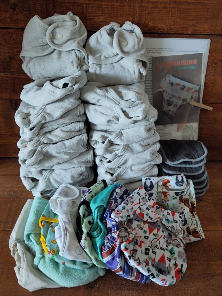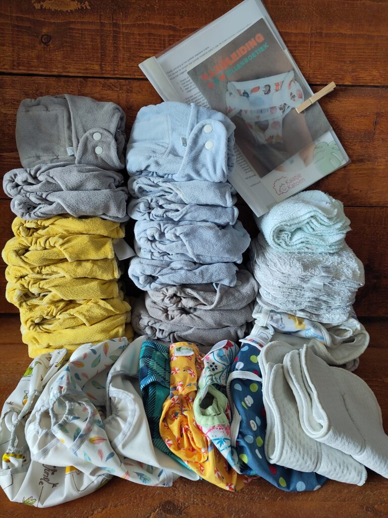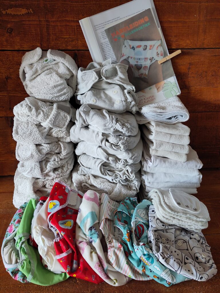 Voorgevormde luiers maat (one size/ maat 2), overbroekjes, pockets, inleggers, oogjesluiers, fleecevellen en een romperverlenger.